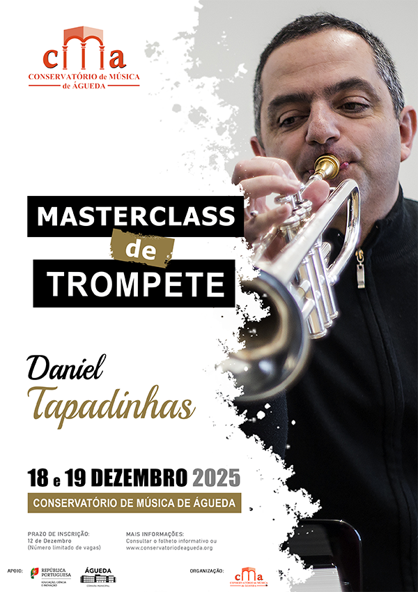 O Conservatório de Música de Águeda vai acolher, nos próximos dias 18 e 19 de dezembro, uma Masterclass de Trompete orientada por Daniel Tapadinhas, docente na Escola Artística do Conservatório de Música de Coimbra e reconhecido trompetista no panorama nacional.